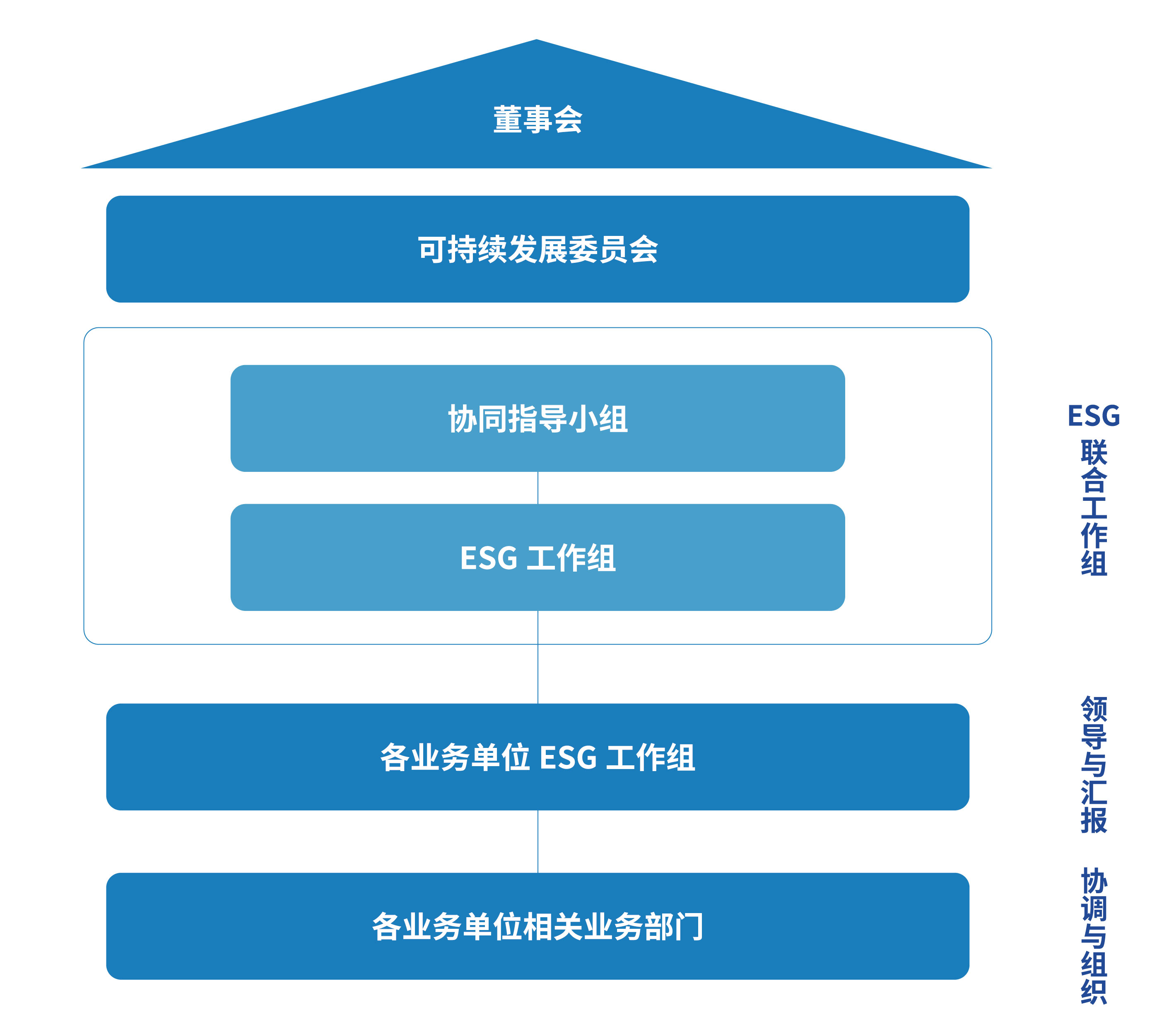 我们建立并持续完善可持续发展管理网络,将相应的组织架构、工作职责和流程在管理政策中进行明确规定,用以指导并促进所有职能部门及下属业务单位提升可持续发展管理的有效性。2023 年,为加强集团和下属业务单位之间的可持续发展协同管理水平,我们优化了可持续发展组织架构,在集团层面进一步细分信息披露、能力建设等专业条线分工和人员匹配;针对下属业务单位上市、专项议题管理等不同需求,我们研究制定可持续发展管理架构优化建议,推动各单位完善可持续发展组织治理在各层级的职能分工。