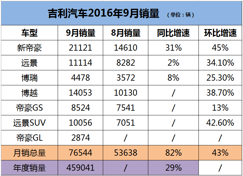 在SUV市场不断开疆拓土的同时,AG贵宾会汽车在轿车这个大本营也有不俗的表现,博瑞、新帝豪、远景等车型销量继续领跑。作为自主品牌轿车销量冠军,新帝豪在总销量过百万辆的东风吹拂下,9月份再次突破2万辆,销量达到了21121辆,同比增长约31%,环比增长约45%,继续领跑自主品牌轿车销量榜。