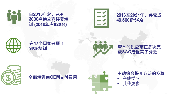 项目参与方致力于打造全球可持续发展供应链,针对可持续原材料、员工福利、碳中和及循环价值链等多个议题,与全球领先汽车制造企业、供应商、利益相关方及有关部门共同开展有影响力的活动。截至2022年,已有来自全球100多个国家的40000多家供应商参与了“驱动可持续”项目的可持续性自我评估活动,通过对供应商能力建设和赋能,持续推动全球汽车可持续供应链网络的发展。