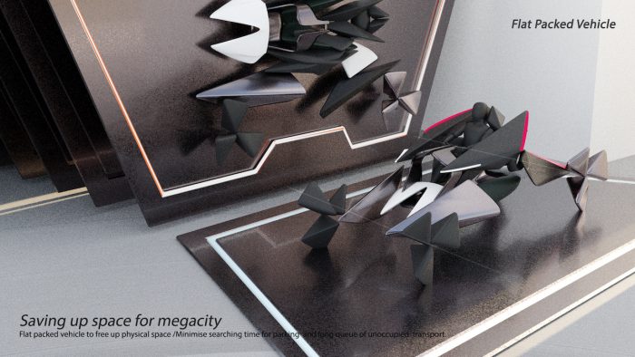 From Hong Kong, Jason Wong imagined a flat-packed vehicle that aims to resolve the headache we face on our daily commute concerning parking. The car can be flattened and automatically transported to a parking hangar for daily servicing and storage. With the battery pack installed underneath, more leeway can also be given to the car’s form and proportion to improve its stance.
