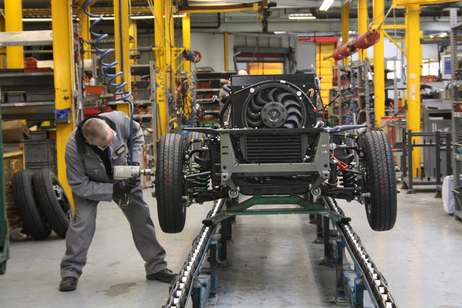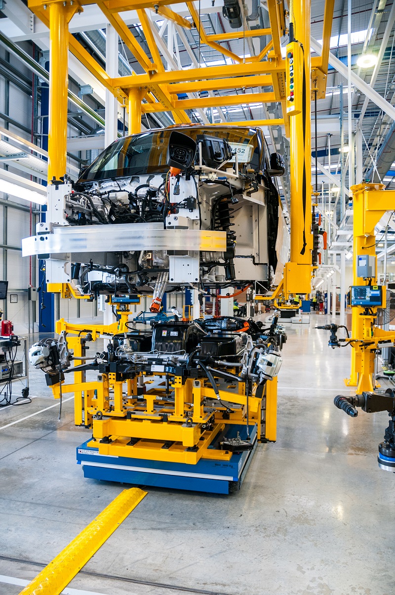 Anodised aluminium TX5 lowered onto chassis unit in new Anstry Plant